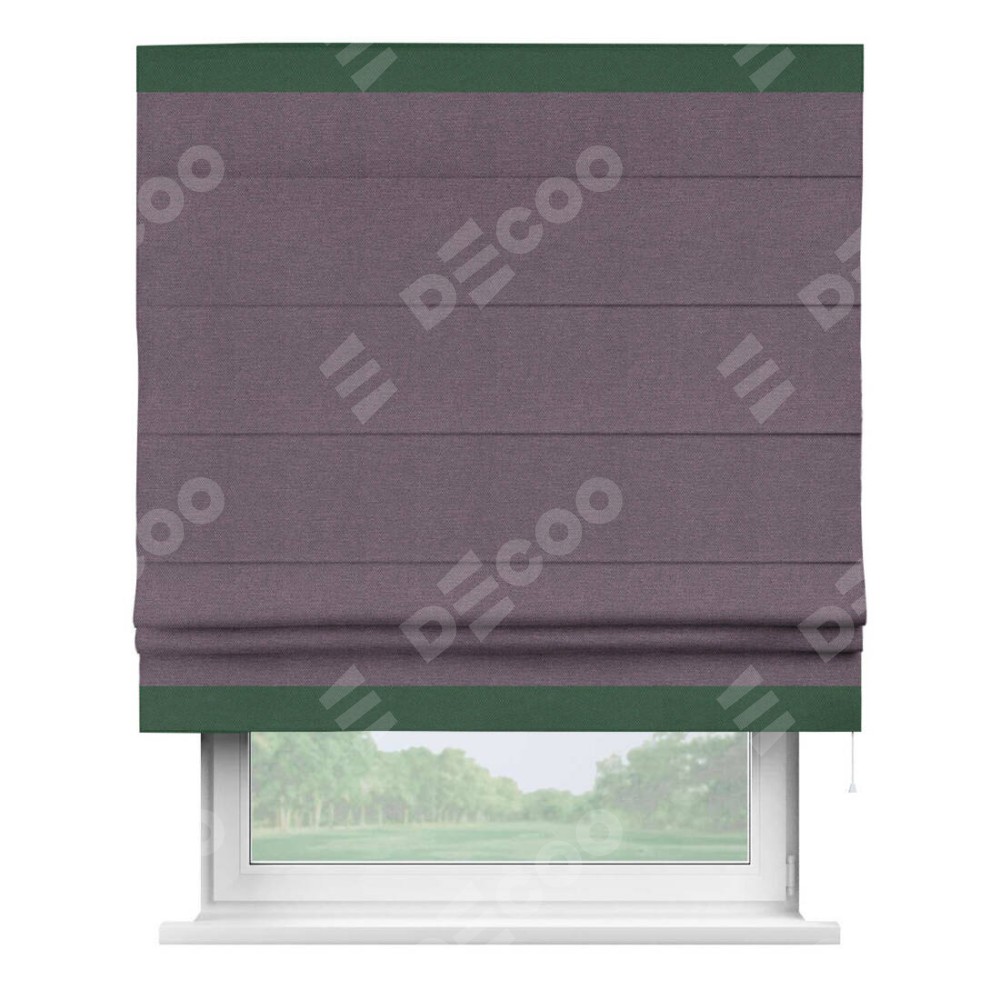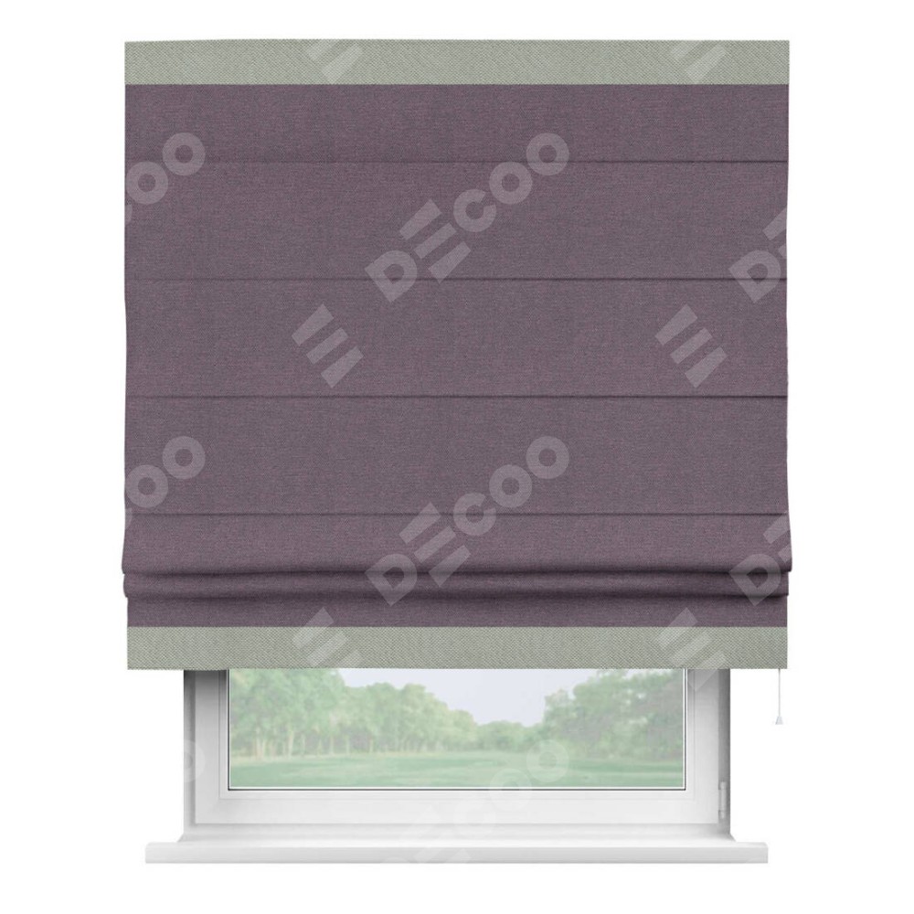 Римская штора производителя «Cortin», используется для проёма, пошита из ткани лён димаут светло-фиолетовый, артикул 83034. Отделка шторы кантом «Горизонт», ткань для канта используется из льна димаут разной расцветки на выбор. Имеет универсальный механизм и подходит для монтажа: на потолок, на стену и в нишу.
