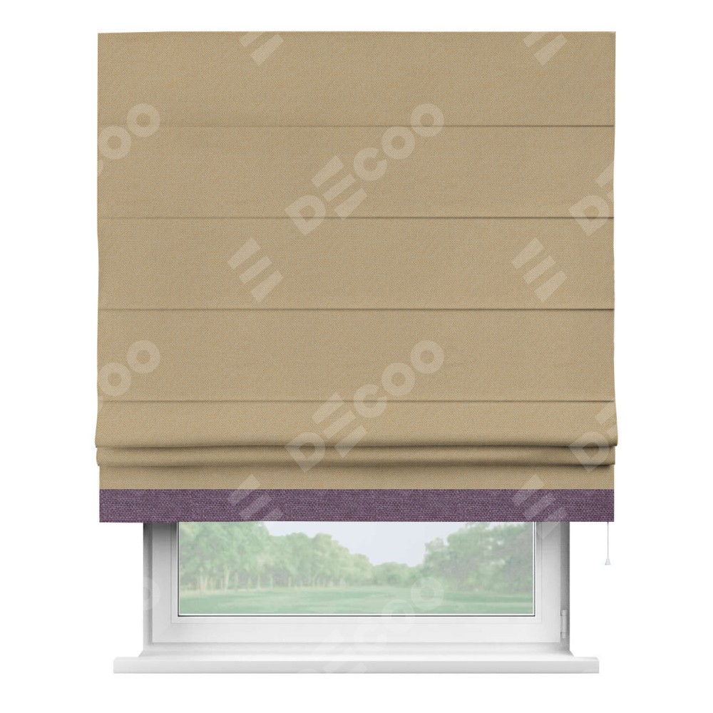 Римская штора производителя «Cortin», используется для проёма, пошита из ткани лён димаут тёмно-бежевый, артикул 83037. Отделка шторы кантом «Джестер», ткань для канта используется из льна димаут разной расцветки на выбор. Имеет универсальный механизм и подходит для монтажа: на потолок, на стену и в нишу.