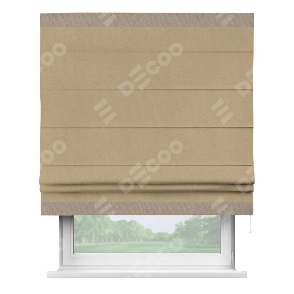 Римская штора производителя «Cortin», используется для проёма, пошита из ткани лён димаут тёмно-бежевый, артикул 83037. Отделка шторы кантом «Горизонт», ткань для канта используется из льна димаут разной расцветки на выбор. Имеет универсальный механизм и подходит для монтажа: на потолок, на стену и в нишу.