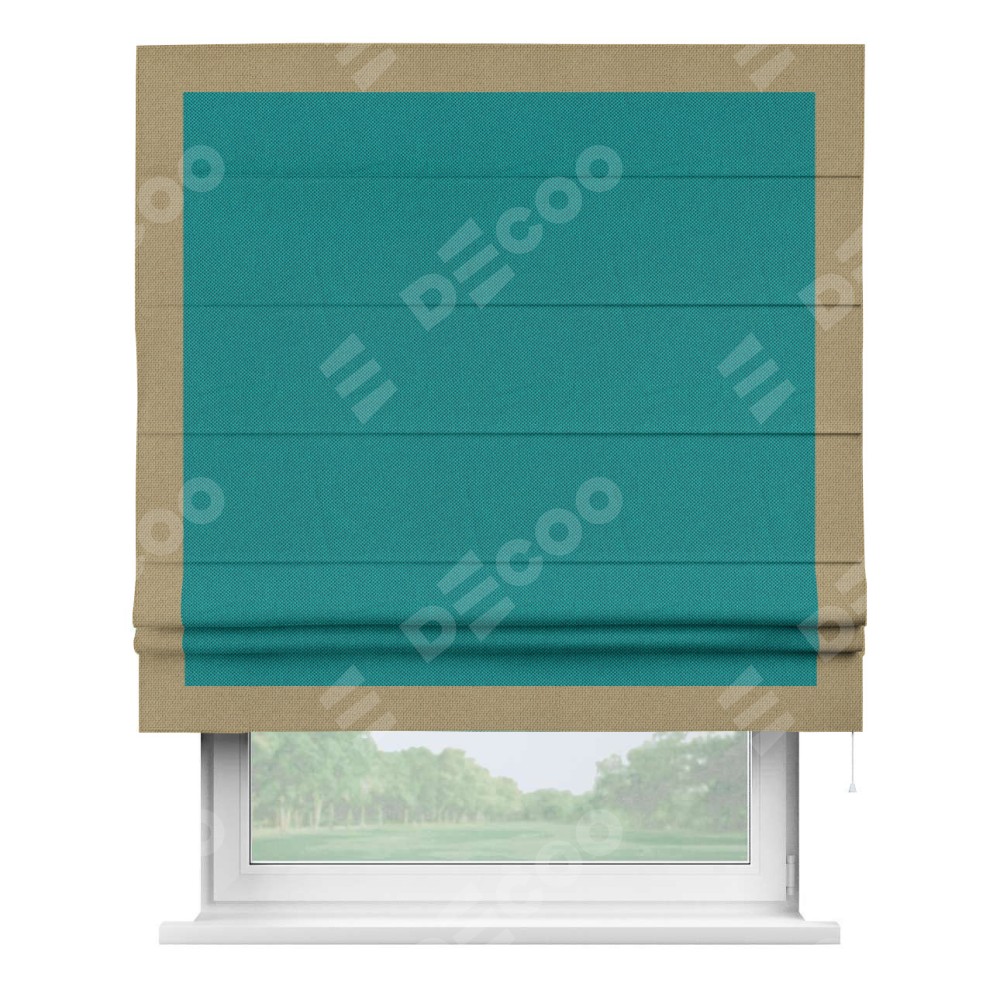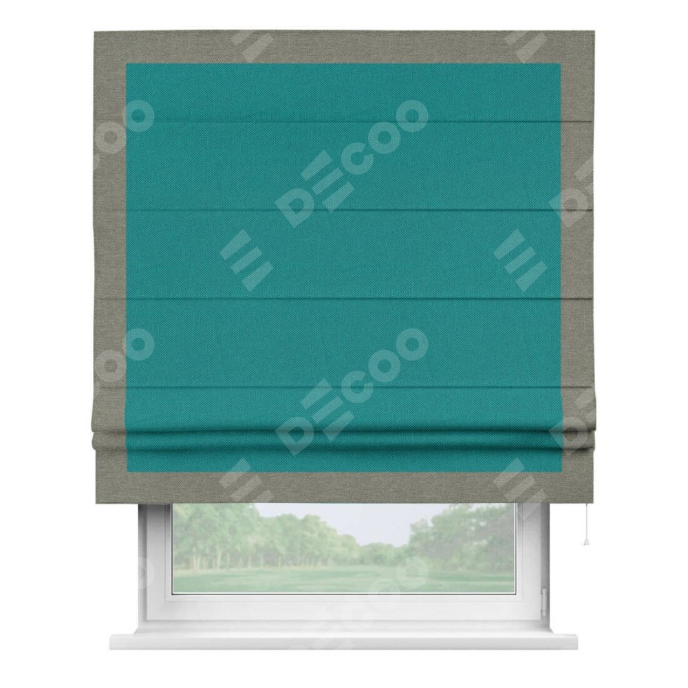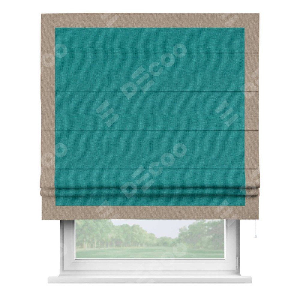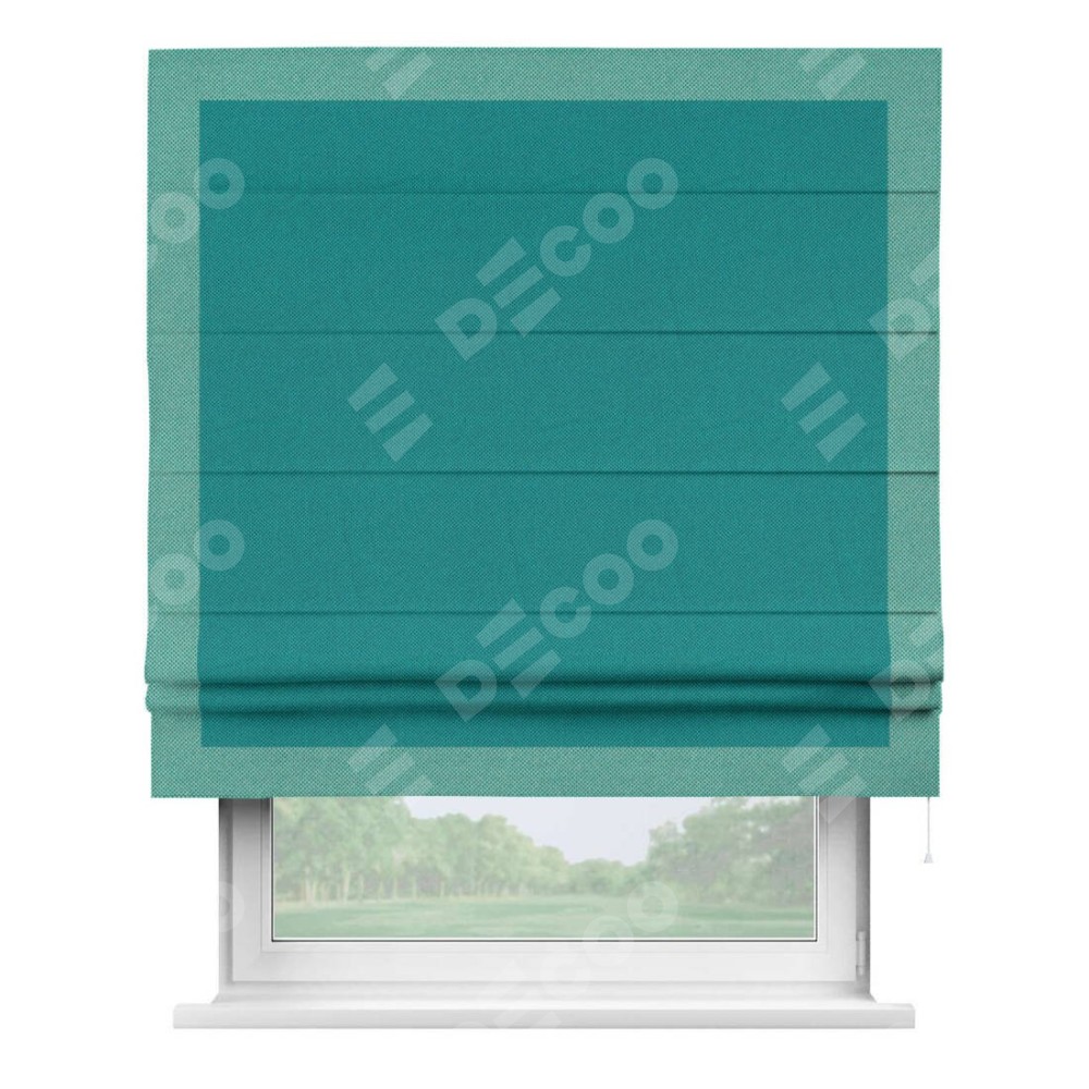 Римская штора производителя «Cortin», используется для проёма, пошита из ткани лён димаут тёмно-бирюзовый, артикул 318. Отделка шторы кантом «Чесс», ткань для канта используется из льна димаут разной расцветки на выбор. Имеет универсальный механизм и подходит для монтажа: на потолок, на стену и в нишу.