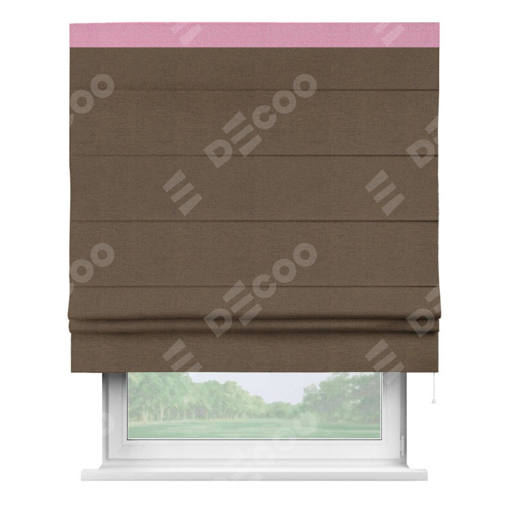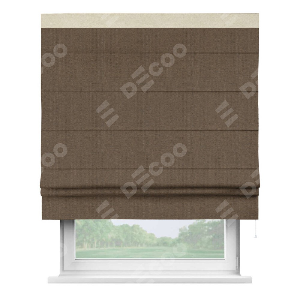 Римская штора производителя «Cortin», используется для проёма, пошита из ткани лён димаут тёмно-коричневый, артикул 83030. Отделка шторы кантом «Кинг», ткань для канта используется из льна димаут разной расцветки на выбор. Имеет универсальный механизм и подходит для монтажа: на потолок, на стену и в нишу.