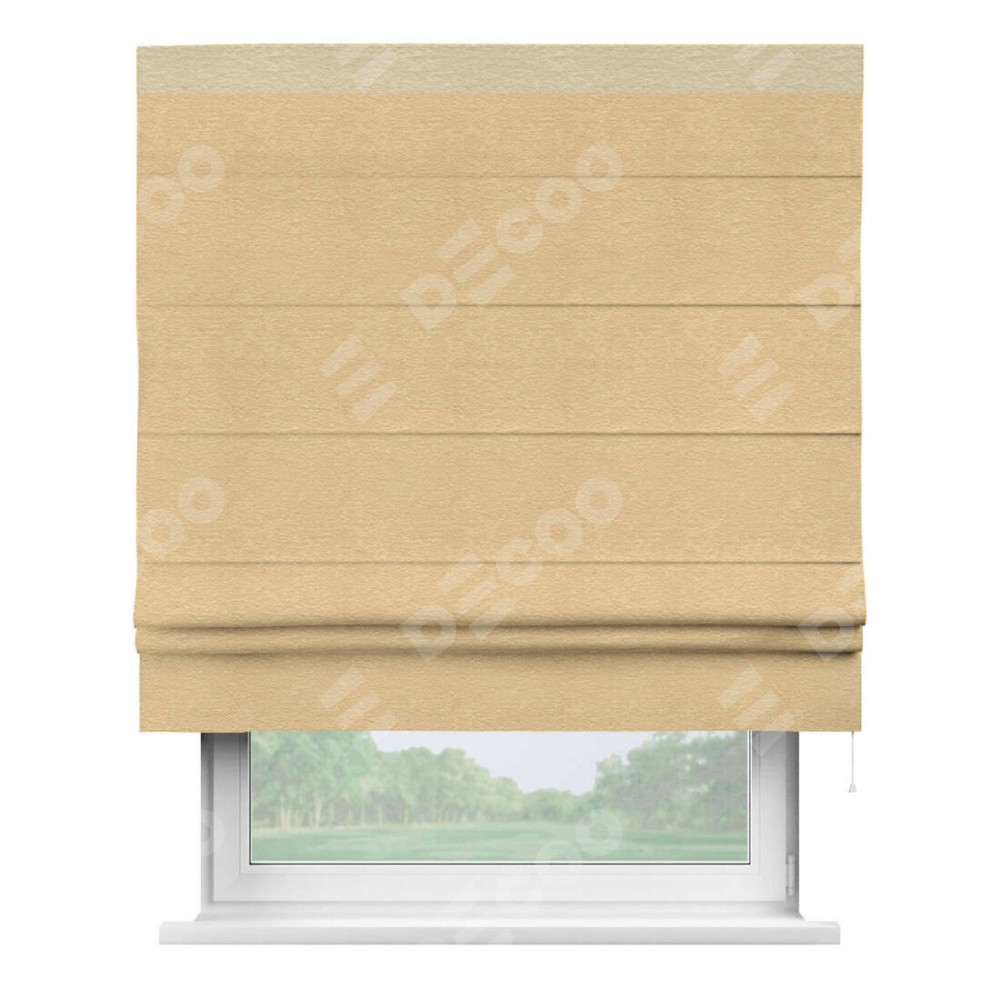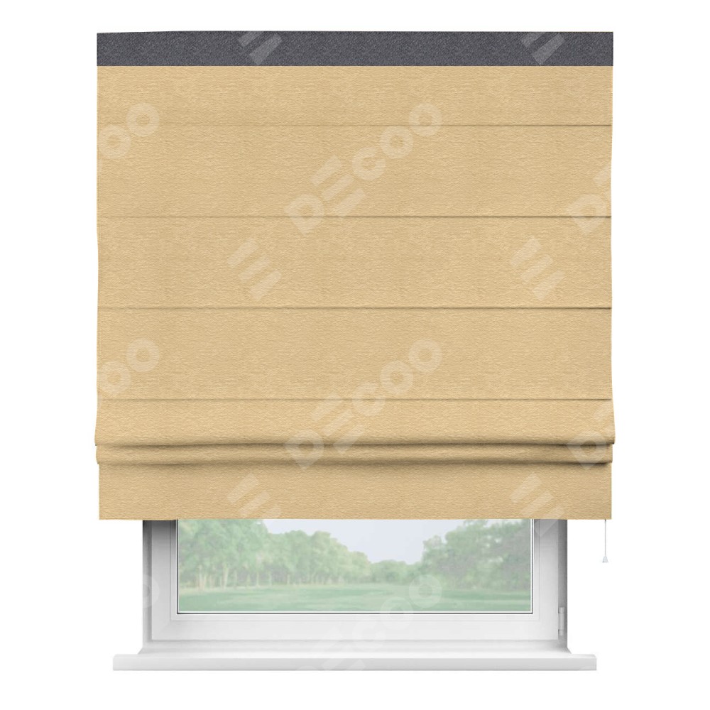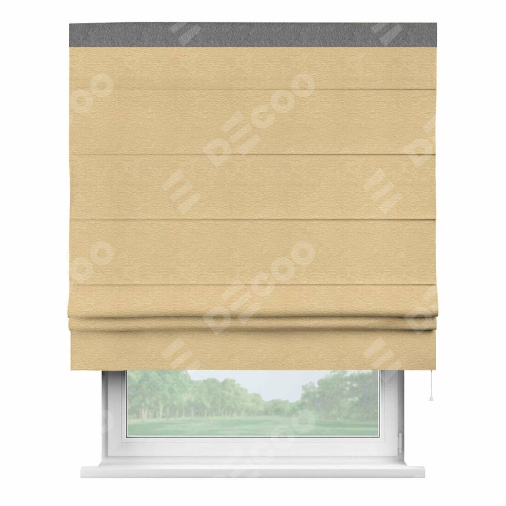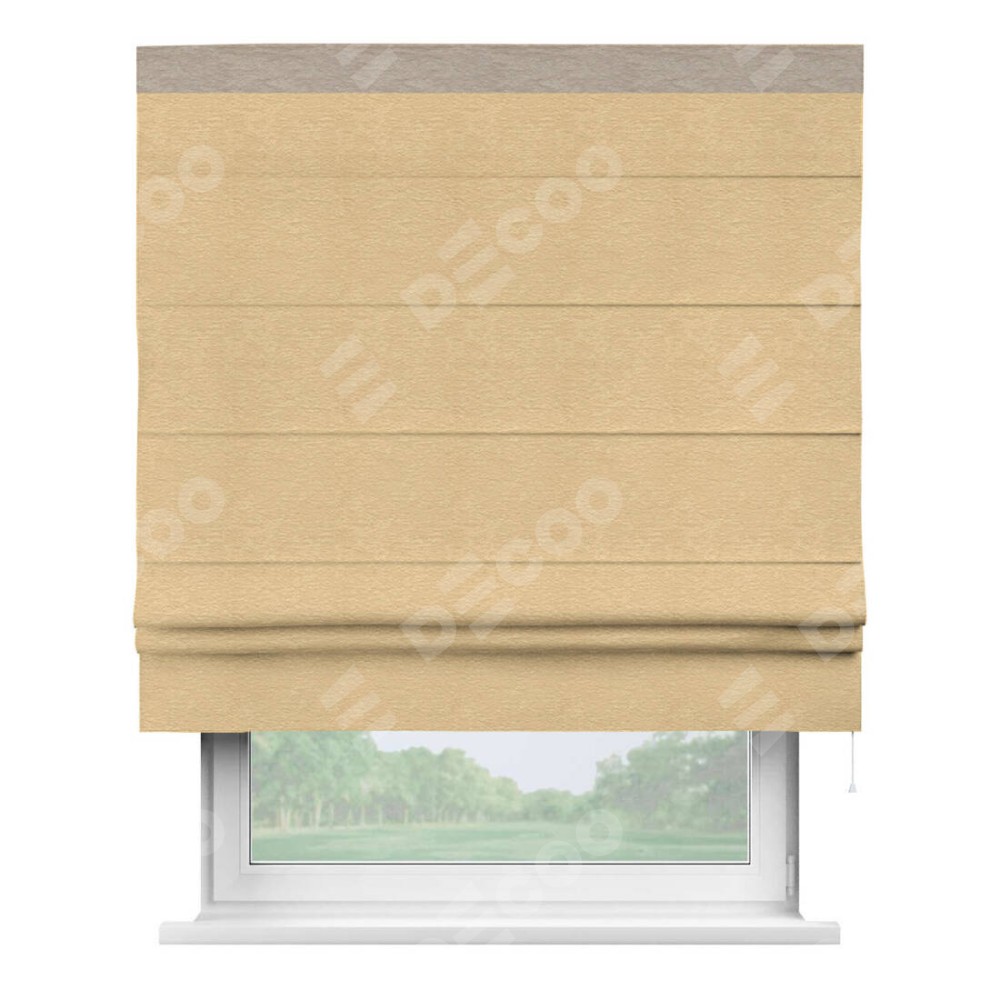 Римская штора производителя «Cortin», используется для проёма, пошита из ткани софт однотонный бежевый, артикул 4202 05. Отделка шторы кантом «Кинг», ткань для канта используется из софта разной расцветки на выбор. Имеет универсальный механизм и подходит для монтажа: на потолок, на стену и в нишу.