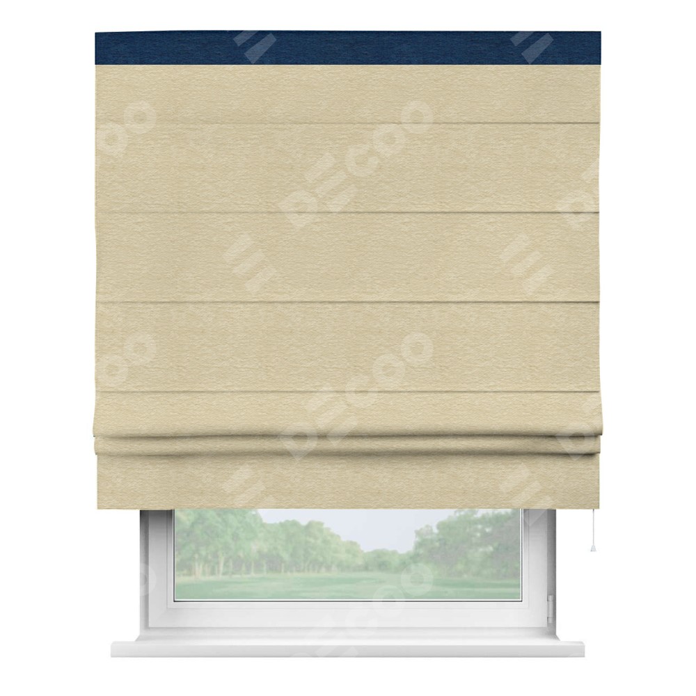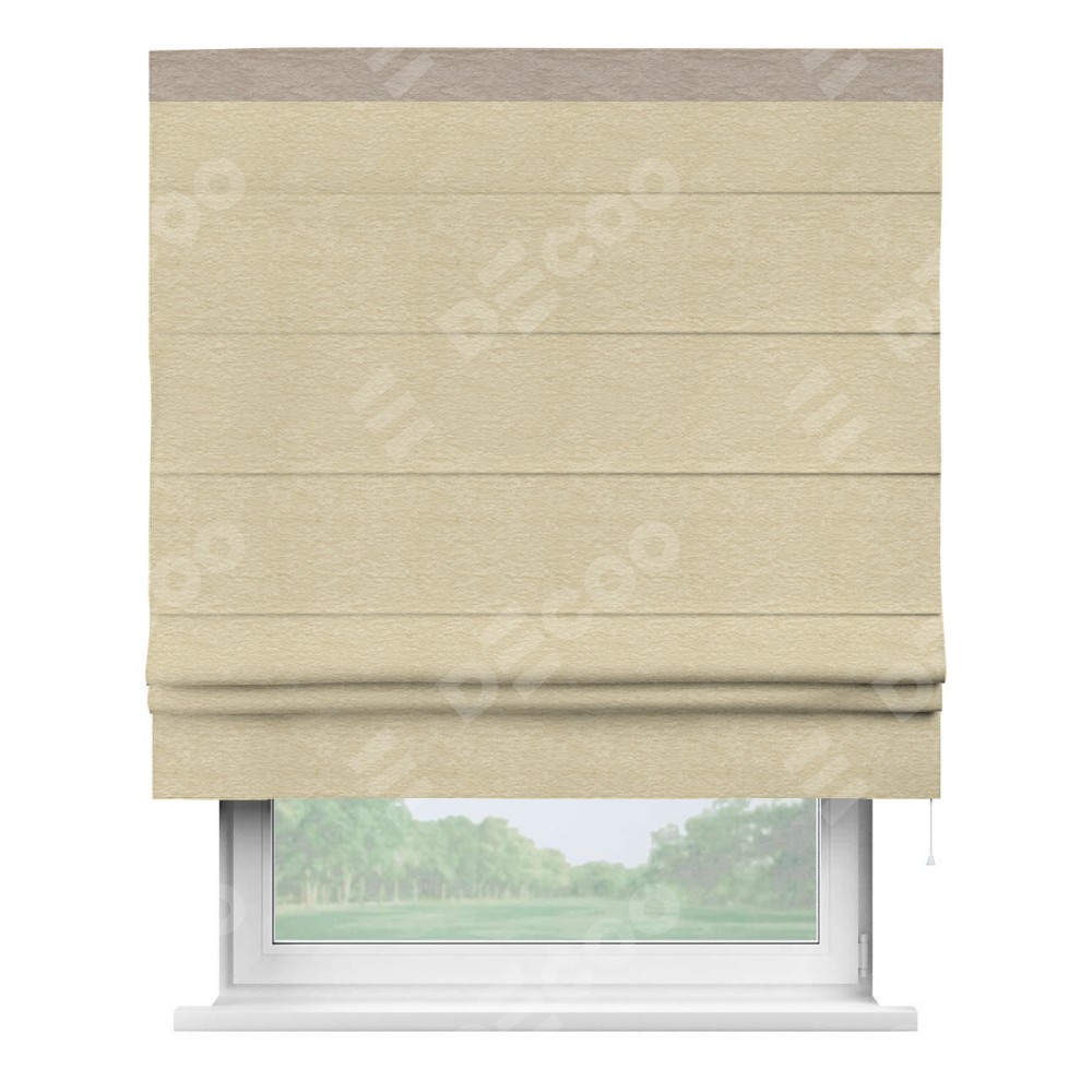 Римская штора производителя «Cortin», используется для проёма, пошита из ткани софт однотонный светло-бежевый, артикул 54426. Отделка шторы кантом «Кинг», ткань для канта используется из софта разной расцветки на выбор. Имеет универсальный механизм и подходит для монтажа: на потолок, на стену и в нишу.