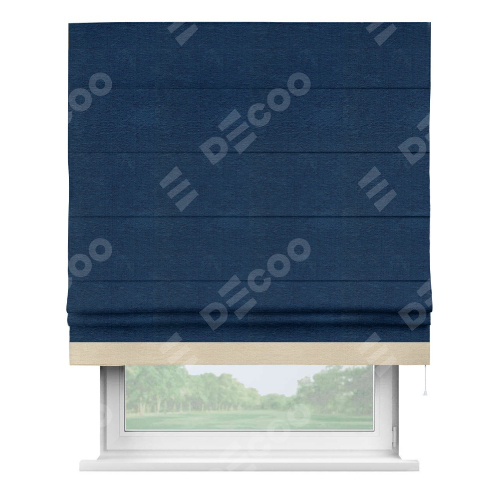 Римская штора производителя «Cortin», используется для проёма, пошита из ткани софт однотонный синий, артикул 42937. Отделка шторы кантом «Джестер», ткань для канта используется из софта разной расцветки на выбор. Имеет универсальный механизм и подходит для монтажа: на потолок, на стену и в нишу.
