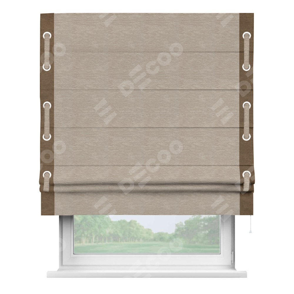 Римская штора производителя «Cortin», используется для проёма, пошита из ткани софт однотонный темно-бежевый, артикул 1640. Отделка шторы кантом «Стрим Дуо» на кантах расположены люверсы с пояском, ткань для канта используется из софта разной расцветки на выбор. Ткань для пояска обычно используется из основной ткани шторы, а так же можно сделать из любой расцветки по желанию. Имеет универсальный механизм и подходит для монтажа: на потолок, на стену и в нишу.