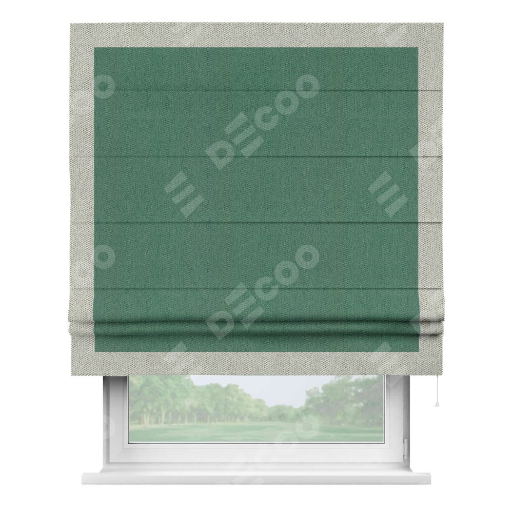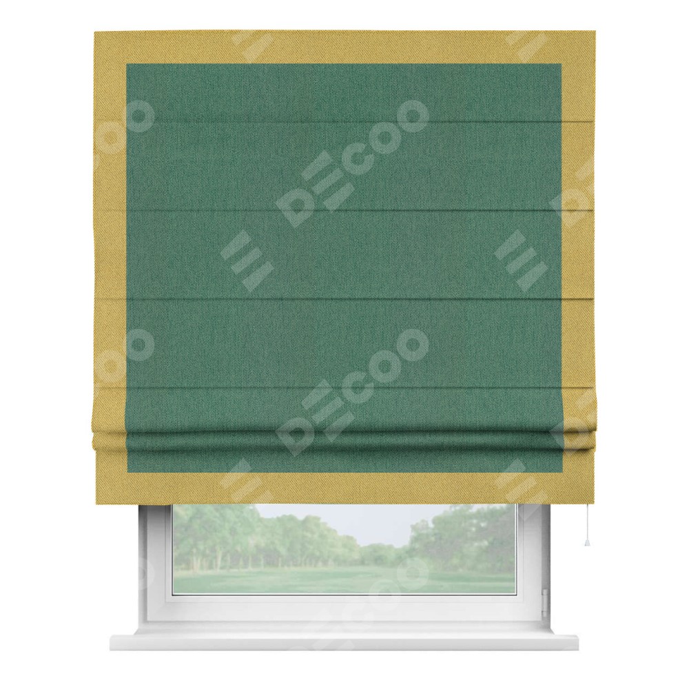 Римская штора производителя «Cortin», используется для проёма, пошита из ткани твид блэкаут зелёный, артикул 21589. Отделка шторы кантом «Чесс», ткань для канта используется из твида разной расцветки на выбор. Имеет универсальный механизм и подходит для монтажа: на потолок, на стену и в нишу.