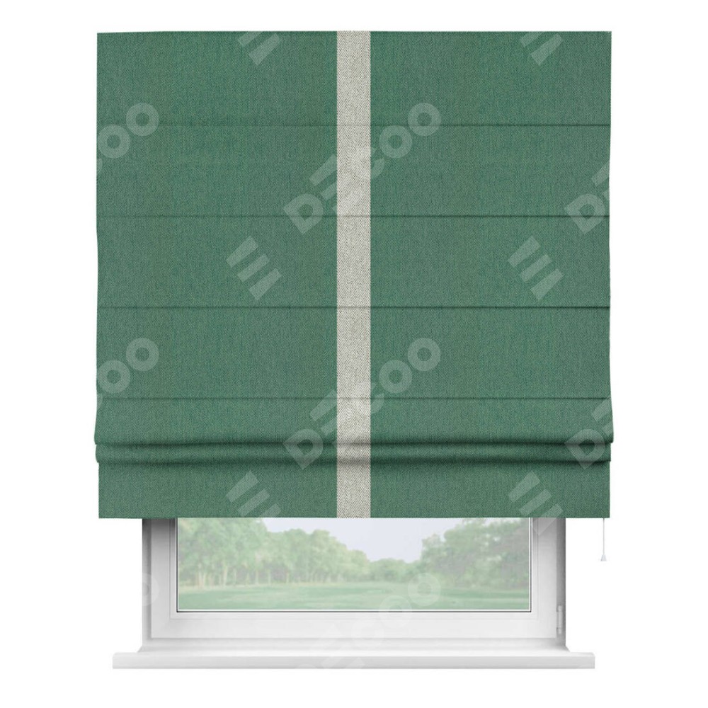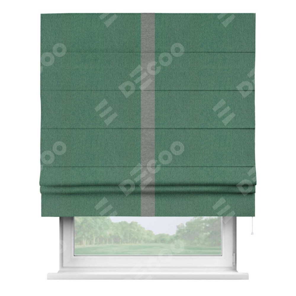 Римская штора производителя «Cortin», используется для проёма, пошита из ткани твид блэкаут зелёный, артикул 21589. Отделка шторы кантом «Хайвэй», ткань для канта используется из твида разной расцветки на выбор. Имеет универсальный механизм и подходит для монтажа: на потолок, на стену и в нишу.