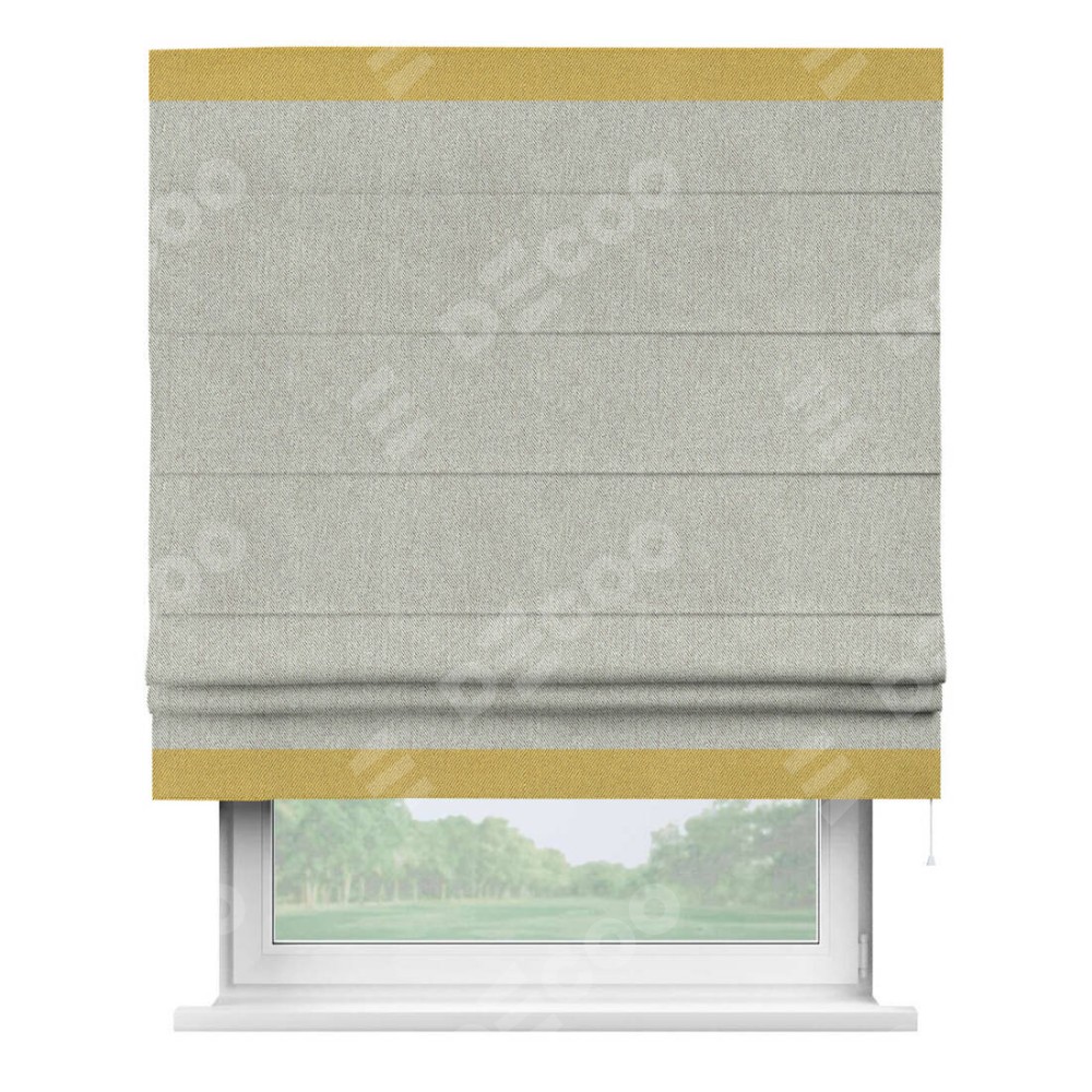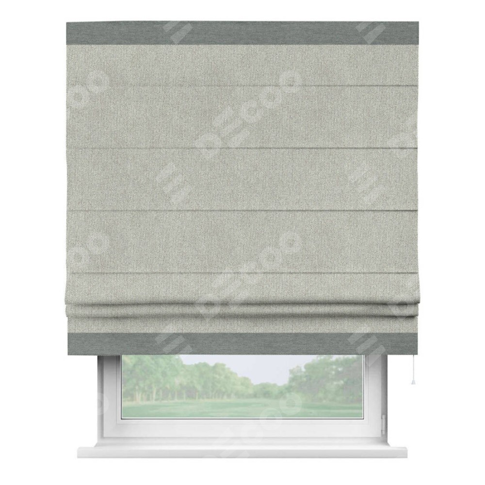 Римская штора производителя «Cortin», используется для проёма, пошита из ткани твид блэкаут коричнево-серый, артикул 21574. Отделка шторы кантом «Горизонт», ткань для канта используется из твида разной расцветки на выбор. Имеет универсальный механизм и подходит для монтажа: на потолок, на стену и в нишу.