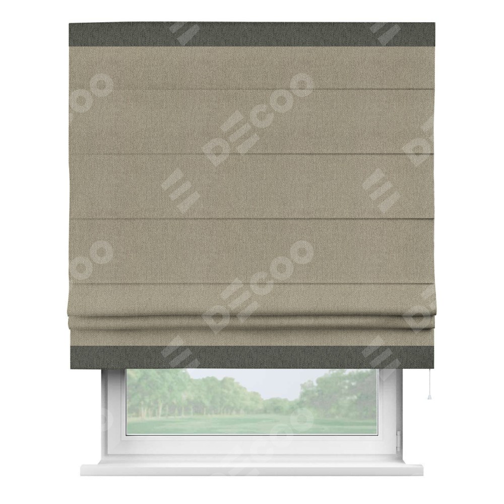 Римская штора производителя «Cortin», используется для проёма, пошита из ткани твид блэкаут кофе, артикул 21575. Отделка шторы кантом «Горизонт», ткань для канта используется из твида разной расцветки на выбор. Имеет универсальный механизм и подходит для монтажа: на потолок, на стену и в нишу.
