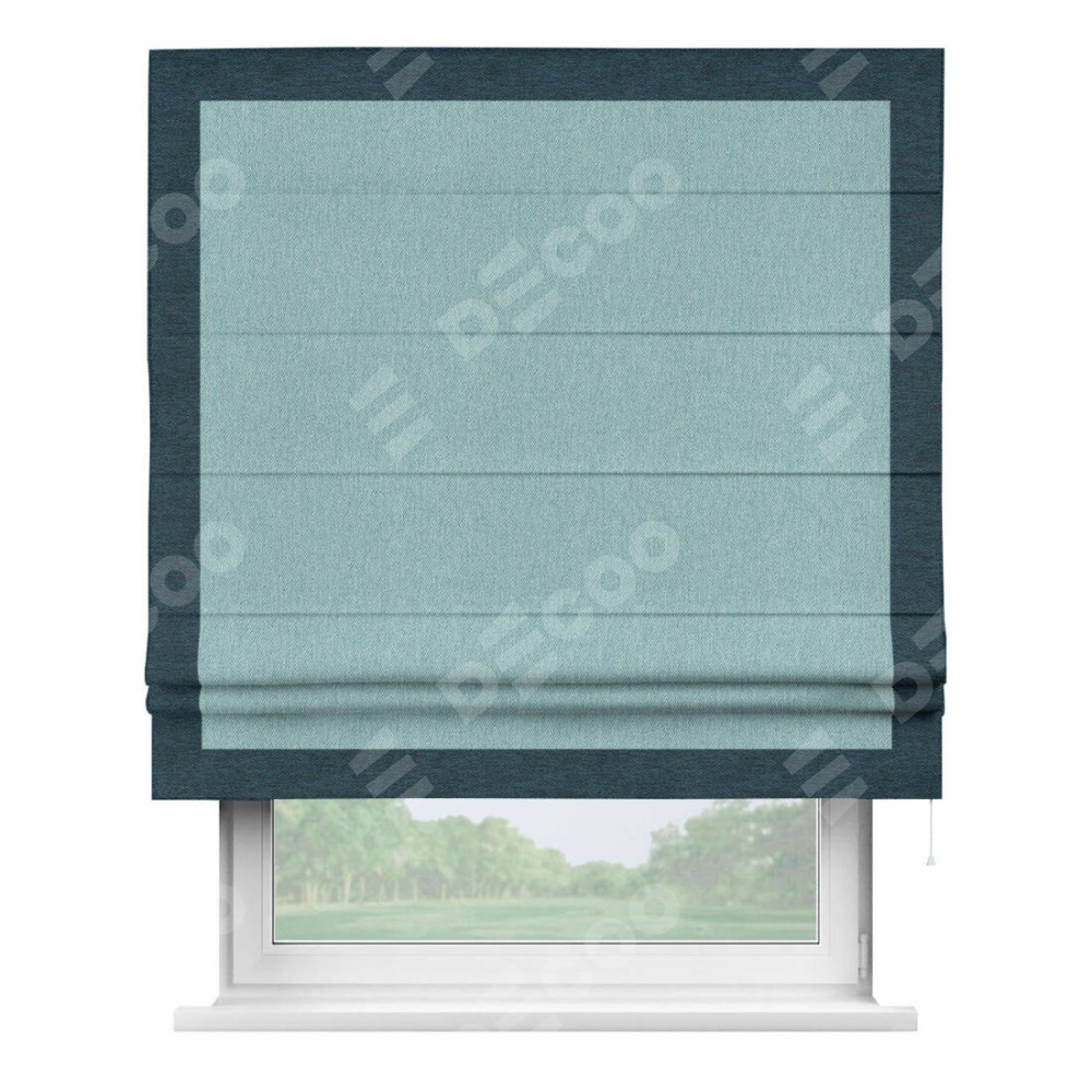 Римская штора производителя «Cortin», используется для проёма, пошита из ткани твид блэкаут небесно-голубой, артикул 21578. Отделка шторы кантом «Чесс», ткань для канта используется из твида разной расцветки на выбор. Имеет универсальный механизм и подходит для монтажа: на потолок, на стену и в нишу.