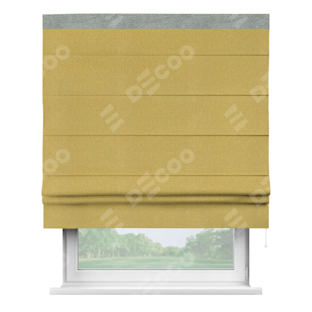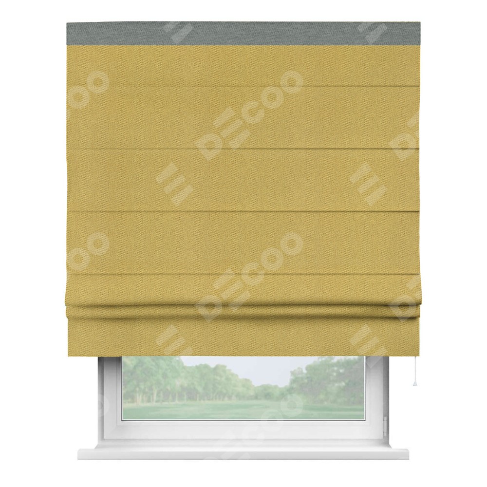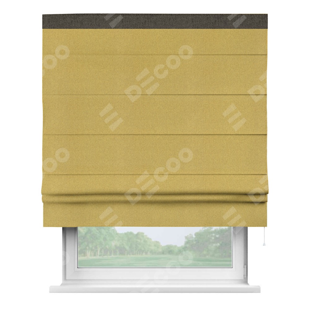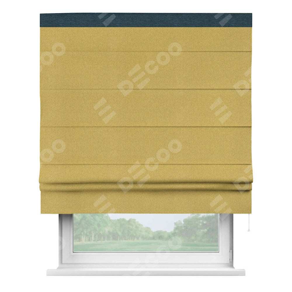 Римская штора производителя «Cortin», используется для проёма, пошита из ткани твид блэкаут пыльная горчица, артикул 21588. Отделка шторы кантом «Кинг», ткань для канта используется из твида разной расцветки на выбор. Имеет универсальный механизм и подходит для монтажа: на потолок, на стену и в нишу.