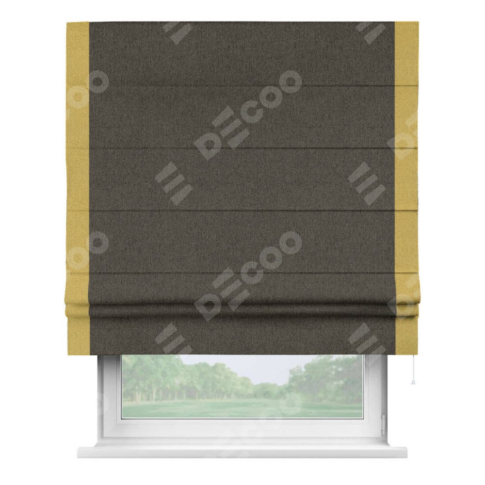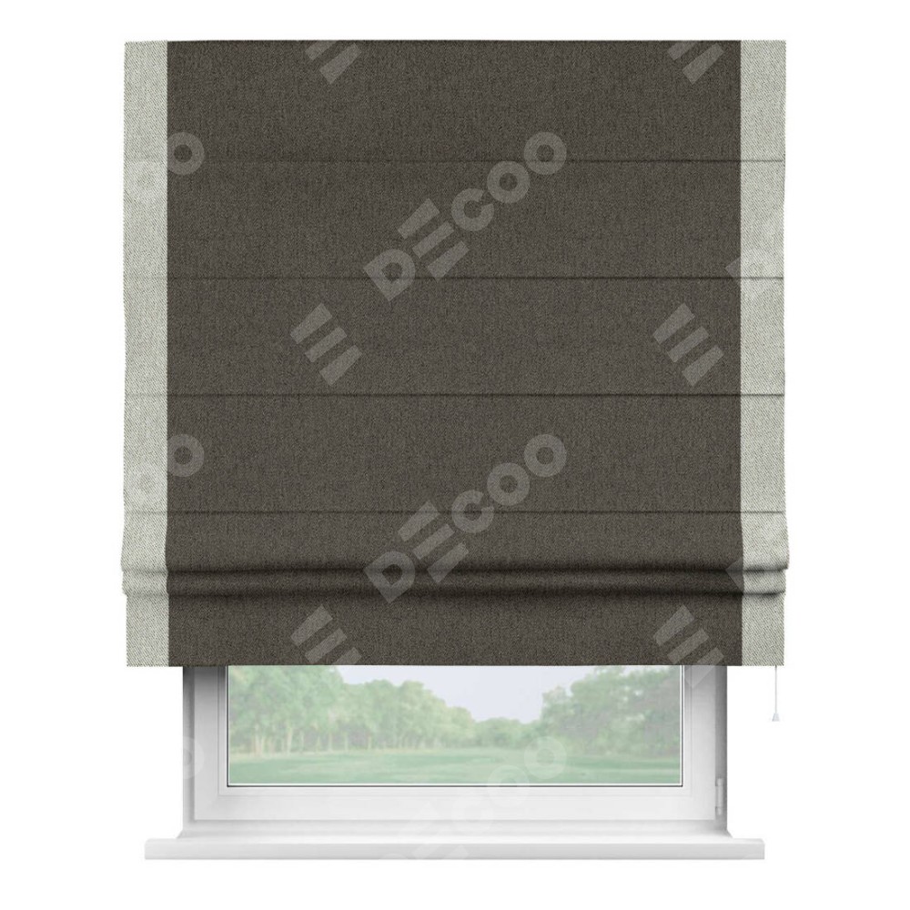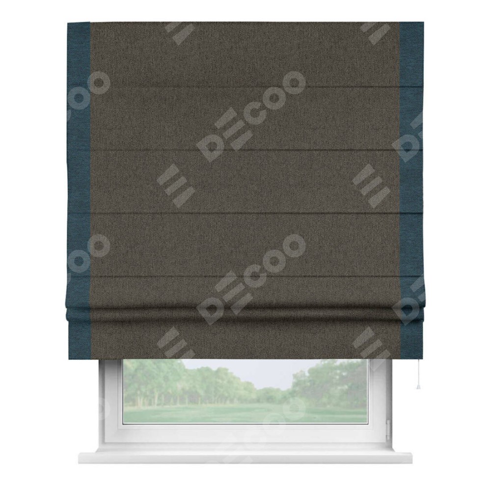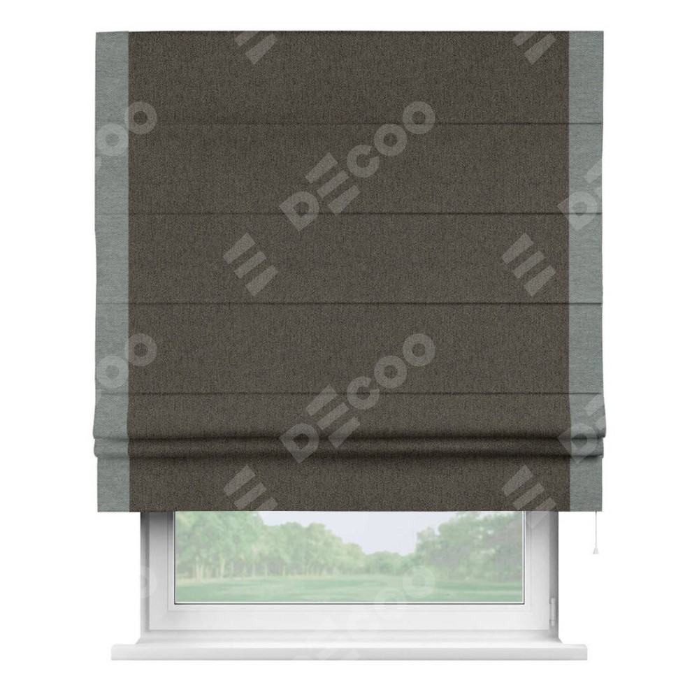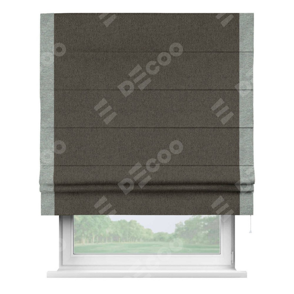 Римская штора производителя «Cortin», используется для проёма, пошита из ткани твид блэкаут тёмно-коричневый, артикул 21584. Отделка шторы кантом «Стрим Дуо», ткань для канта используется из твида разной расцветки на выбор. Имеет универсальный механизм и подходит для монтажа: на потолок, на стену и в нишу.