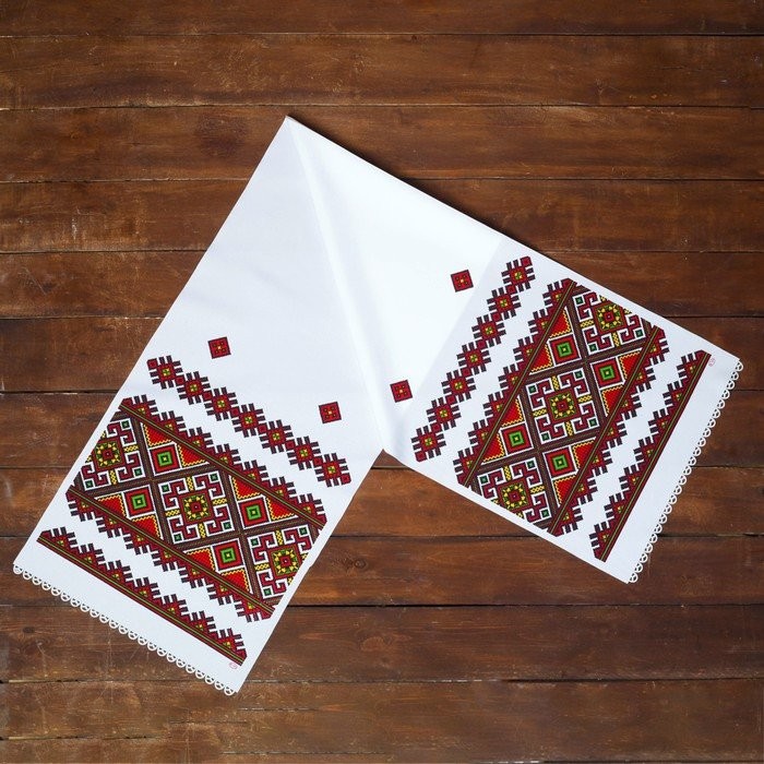 Рушник под ноги. Кто первым из молодых на него встанет — тому и быть хозяином в доме. Лучше отказаться от вариантов, на которых изображена пара голубей или лебедей, а также кольца. Считается, что супруги могут затоптать своё счастье. Лучше отдать предпочтение геометрическим или растительным узорам.