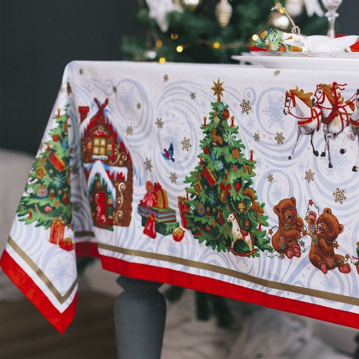 Скатерть украсит праздничный интерьер. Изделия с эксклюзивным принтом сшито из хлопкового полотна. Этот материал имеет плотную и упругую структуру, обладает высокой прочностью и на ура справляется с первостепенными задачами: