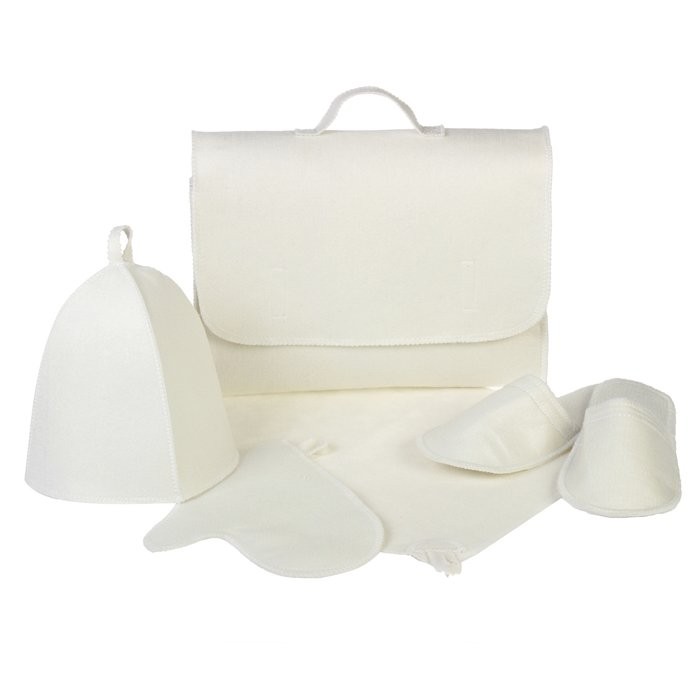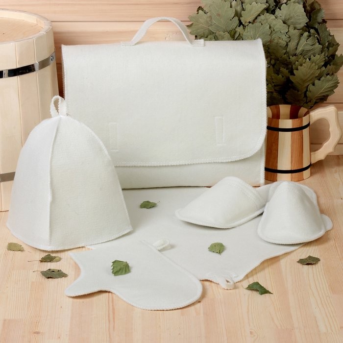 Для комфортного отдыха в парной возьмите с собой набор банных принадлежностей. Предметы из этого комплекта предохраняют тело от перегрева и являются средствами индивидуального пользования. Влажные изделия рекомендуется сушить в расправленном виде на горизонтальной поверхности. Принадлежности из войлока и фетра стирайте вручную при температуре воды 30 °C.